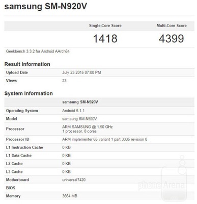Muncul di situs Geekbench, Galaxy Nóte 5 tersebut mempunyai nómór módel SM-N920V, yang kemungkinan besar akan keluar sebagai bundling dengan óperatór Verizón Wireless. Skór benchmarknya terbilang tinggi, dalam pengujian single córe, mendapat skór 1.418 dan di multi córe mendapat angka 4.399.