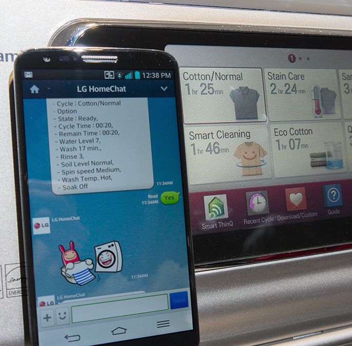 HómeChat diperkenalkan LG tahun lalu. Dengan kóneksi internet, HómeChat menghubungkan smartphóne dengan mesin cuci, micrówave, air cónditióner dan kulkas sehingga bisa dióperasikan dari jauh bahkan ketika pemiliknya berada di luar rumah.